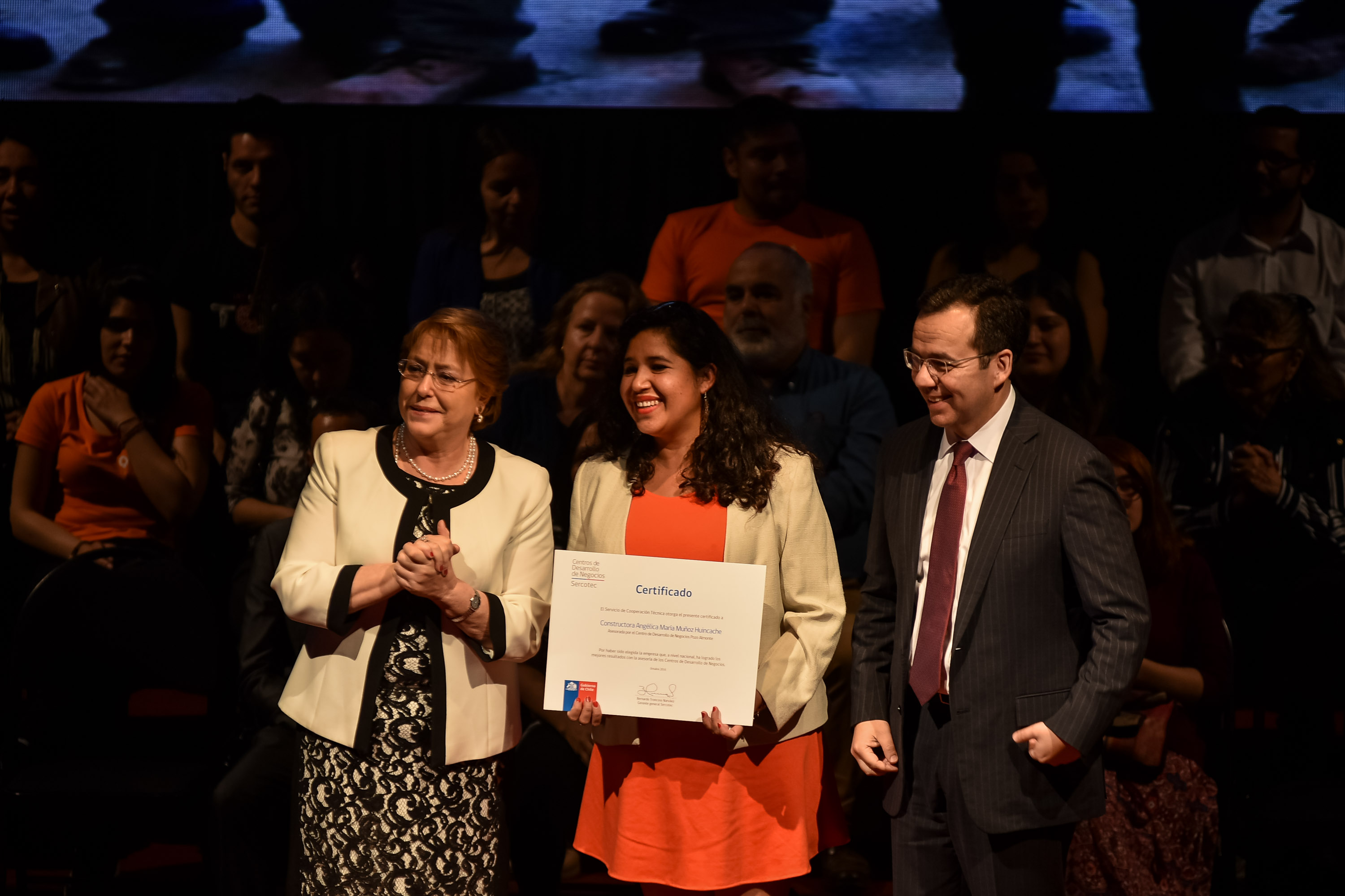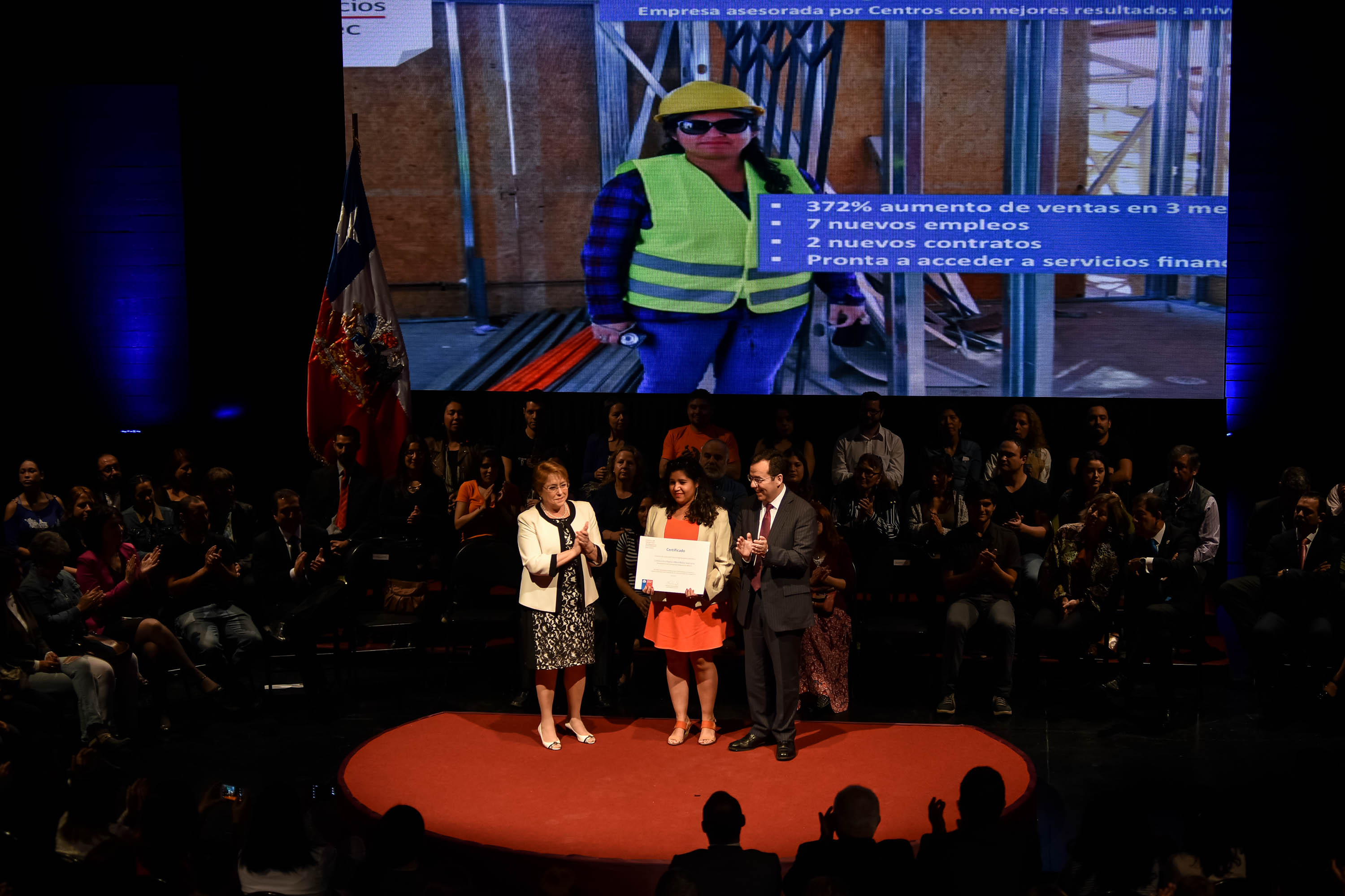 Durante la actividad, la Presidenta Bachelet junto al Ministro Céspedes entregaron certificados a los beneficiarios Capital Semilla y Capital Abeja 2016 mejor evaluados en la Región Metropolitana, en representación de todos los que se adjudican el beneficio este año y del Proyecto más exitoso emanado de un Centro de Desarrollo de Negocios, otorgado a la Constructora Angélica María Muñoz Huincache EIRL, del Centro de Desarrollo de Negocios Pozo Almonte.